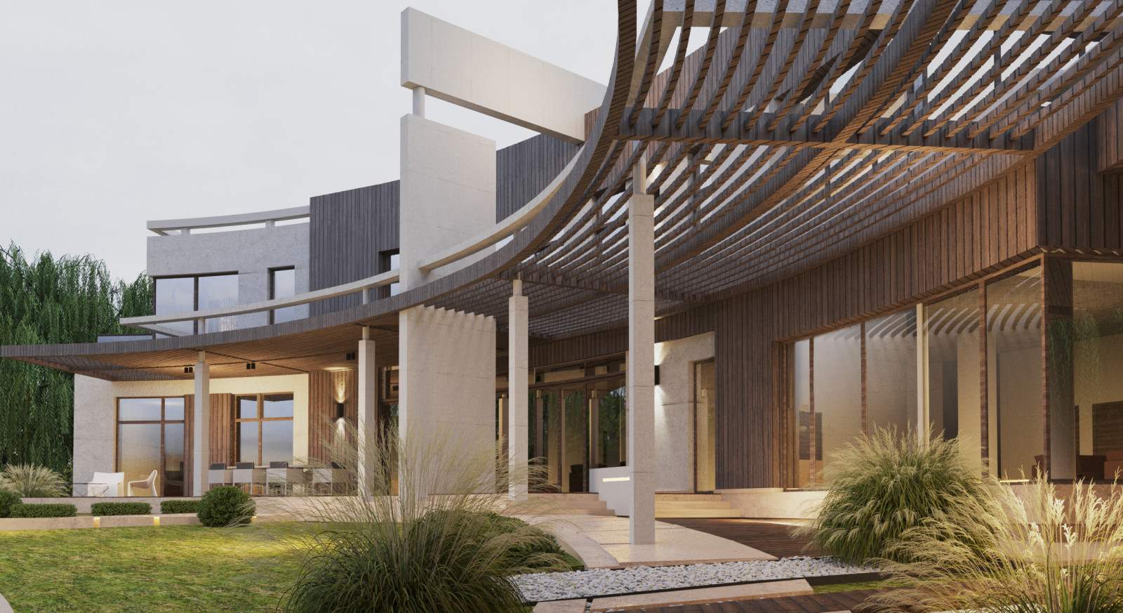The layout of Manor Residence is represented by two arcs or waves, one of which starts at the entrance - a garage, the second ends with a boathouse - by the river. The idea is that one wave captures at the entrance, the other invites you to sail away on a journey. This is a new look at the Yin-Yang symbol, embodied in an architectural form - an endless life principle of movement and flow of one into another.