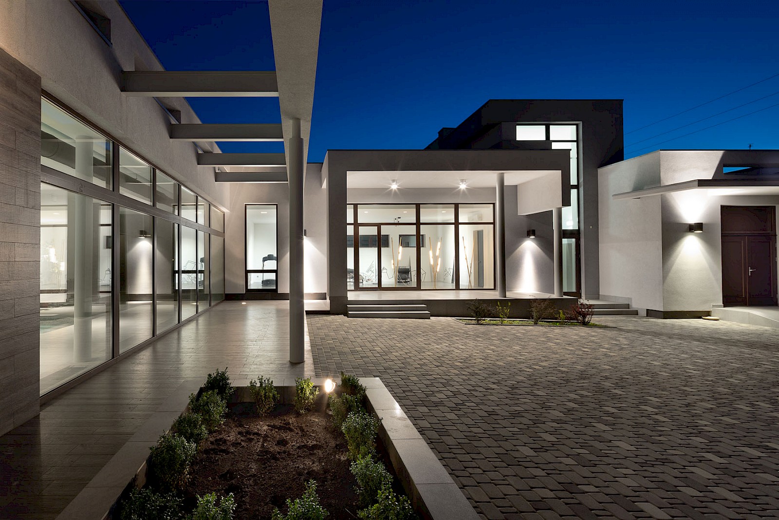 The architecture of Villa Swift is the transparent geometry of regular lines, the embodiment of concise forms and minimalism. Simple volumes have found ideal ratios in all directions, where the look follows - up or along. Panoramic windows almost completely erase the line between the outer and inner spaces and at the same time introduce a feeling of security. Giving the facade lightness, panoramic windows free architecture from the weight of concrete and metal. Interiors take on the character of infinity. With all the simplicity of the sound, it turned out a complex architecture with a large number of spatial details. The intersection of pergola beams and columns, the alternation of openings and blind elements of the facades, a huge reflective array of glass, all together set in motion a magical play of light and shadow both during the day and in artificial light.