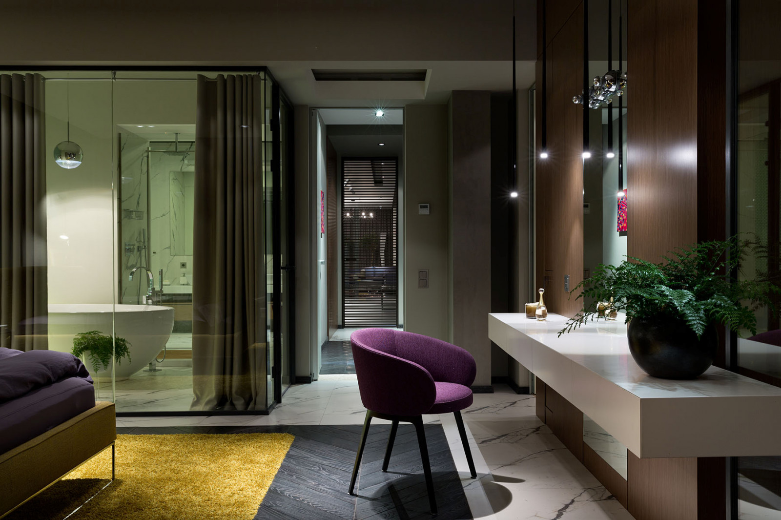 prints continued collection in the master bedroom, which is also addressed as an open space. Glass