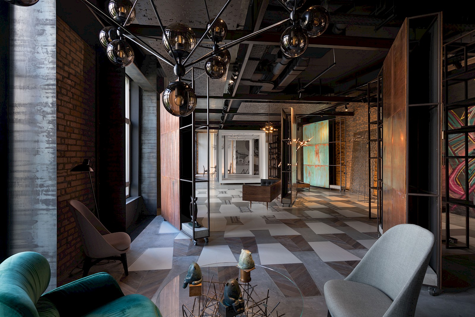A movable partition is another one designed to modify functional zones. Besides, the movable partition is used in the part of decorative light. This solution allows us to keep the space open and fill it with rich textures like copper and metal in patina on partition. The floor of the other part is a carpet made of Metllach tiles, modern ceramics, concrete, wood and metal. It looks like incrustation and is a true art object. Following the idea of duality in our gallery we keep the walls in the original state of red brick and concrete. The same we’ve done with the ceiling. We use the brick as a message to remind about outdoor area and as a slight hint of garage style. We have created street art painting on some walls as a part of the concept of exterior in interior esign. It brings colours and scale into interior.